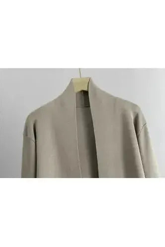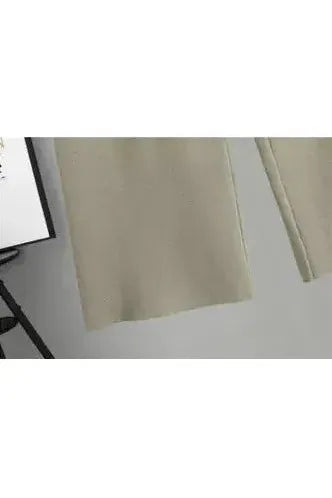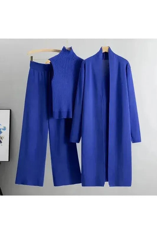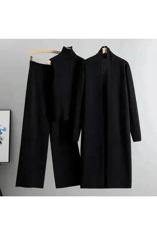 Wrap yourself in timeless sophistication and unmatched comfort with the Amelia Knitwear Set. This three-piece ensemble features a sleeveless turtleneck top, wide-leg knit pants, and a long open-front cardigan, offering a chic yet relaxed aesthetic perfect for any occasion. Designed for versatility and effortless style, this set seamlessly transitions from lounging at home to elevated casual outings.